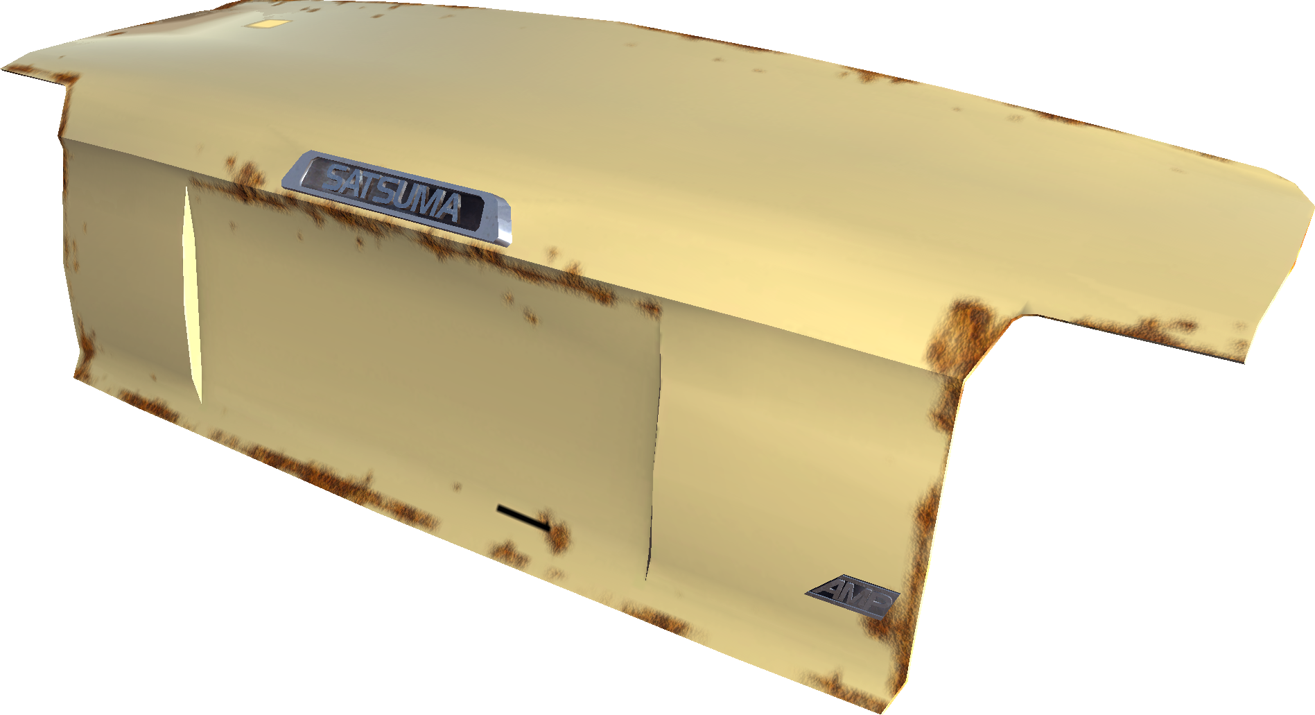 : Takaluukku) is a car part which can be found inside the garage at home. It is attached to the back of the car with 4x6mm bolts. The boot lid can be opened and closed by pressing and holding down left click in the bottom middle part. It features a Satsuma Motors logo with an AMP badge located on the bottom right. The turbo badge can be attached to the bottom left of the boot.