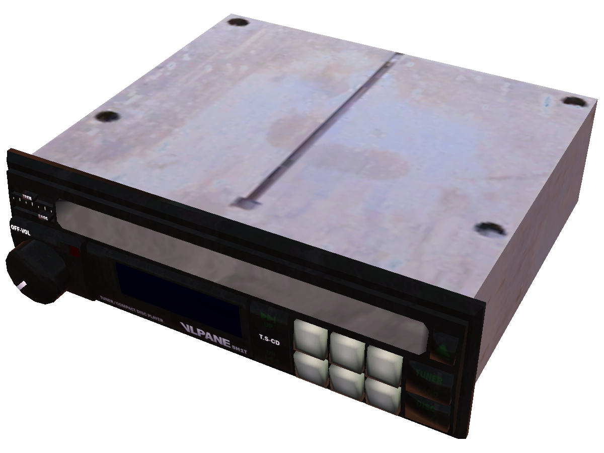 : CD-soitin) is a car part which can be bought from the parts catalog in the garage at home for 1,395 mk. It is attached to the dashboard meters in place of the stock radio without any bolts. As the name suggests, the player can use it to listen to CDs. The CD player also allows for faster channel surfing than the stock radio. It is the only radio unit that supports the subwoofers and amplifier.