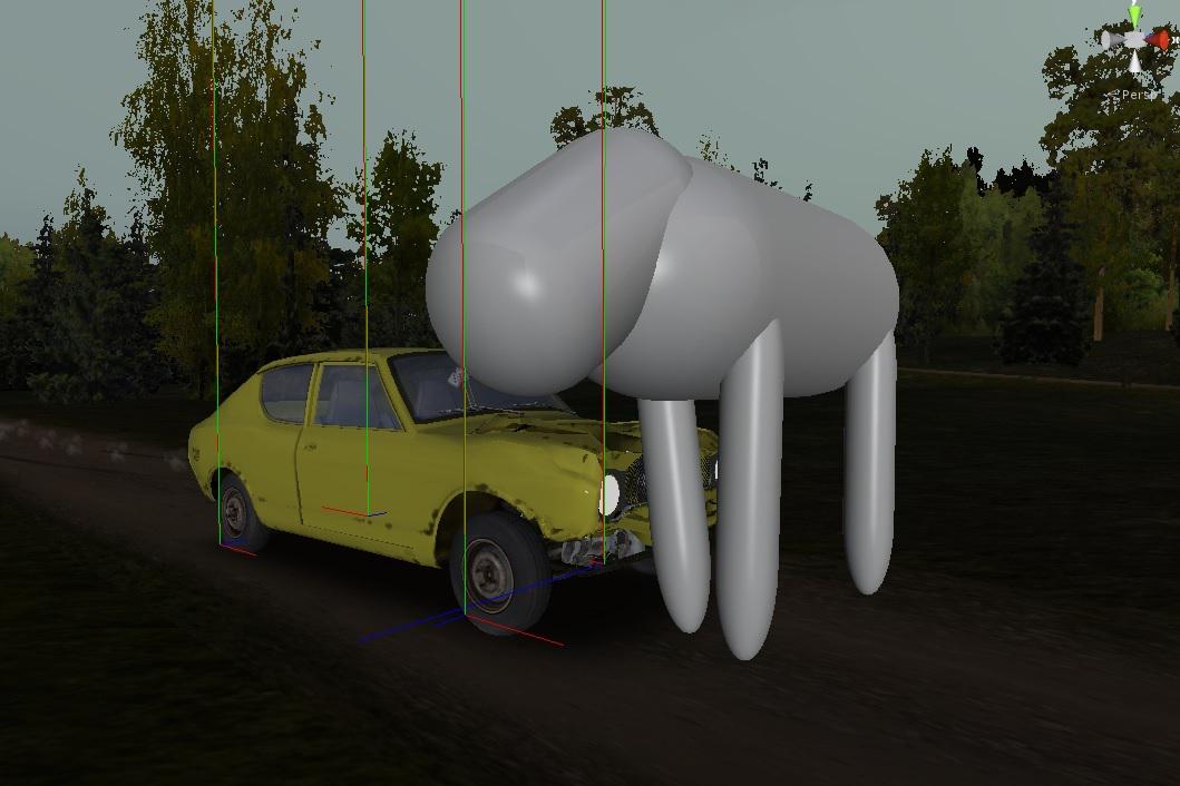 Coming in contact with a galloping moose while driving a vehicle at a high speed will likely prove fatal to the driver and/or the vehicle. Once killed, the corpse of the moose will remain in the game world until the player exits the game or saves.