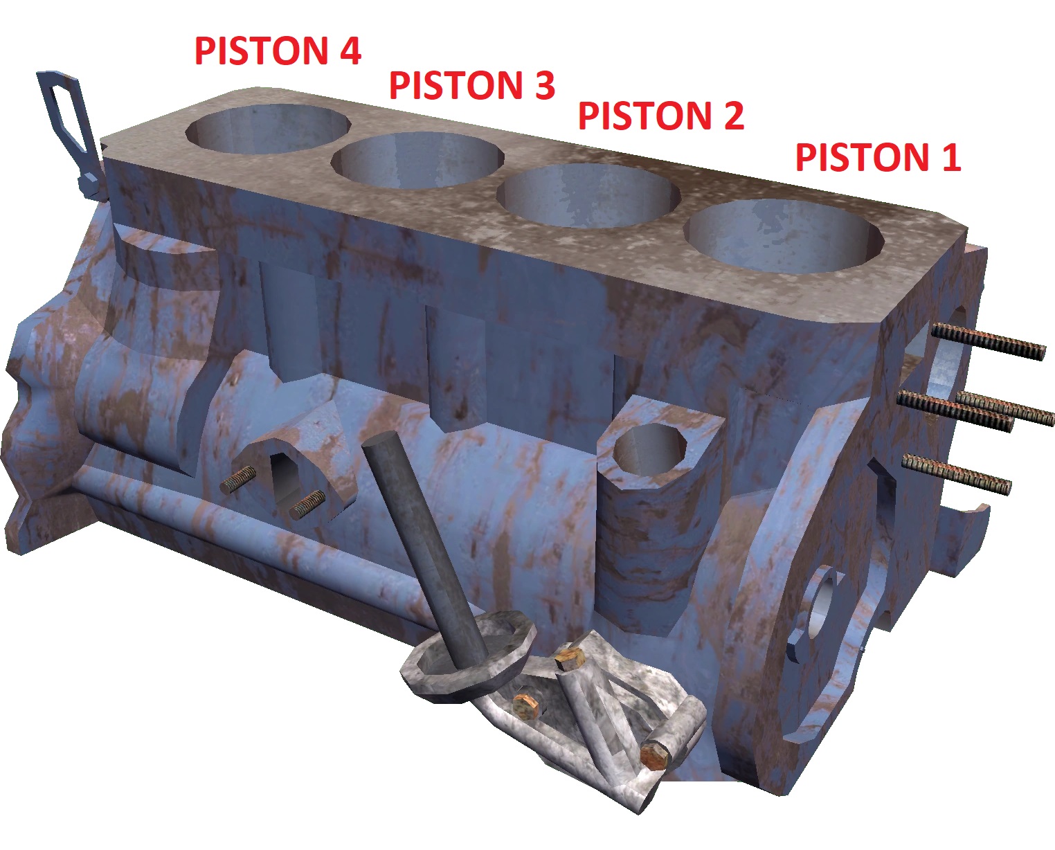 The pistons can be worn down with use, or if the engine is improperly built/tuned. Critically worn pistons emit blue smoke into the exhaust system and engine will lack power (due to lack of compression) indicating that a replacement is in order. Pistons broken from common wear seize up instead of exploding from the block. If a piston is damaged or broken, it may be serviced or replaced at the Fleetari Repair Shop: